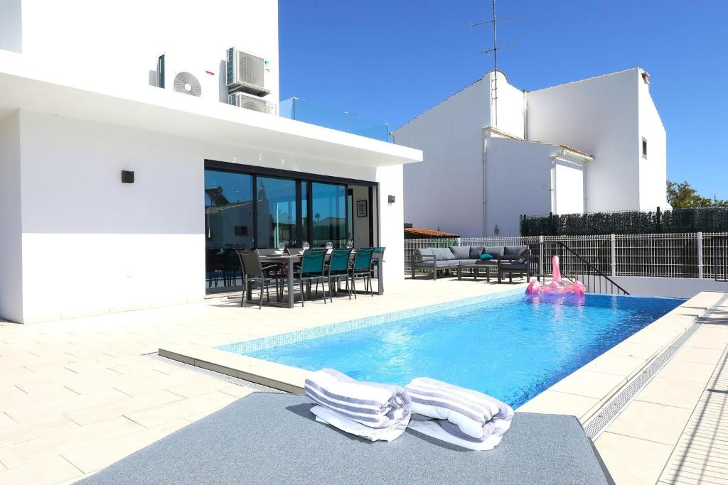 A very clean and modern newly built villa sat in a quiet area just outside Tavira town centre. The private pool and outdoor spaces are great and you will have no problems with the modern interior.